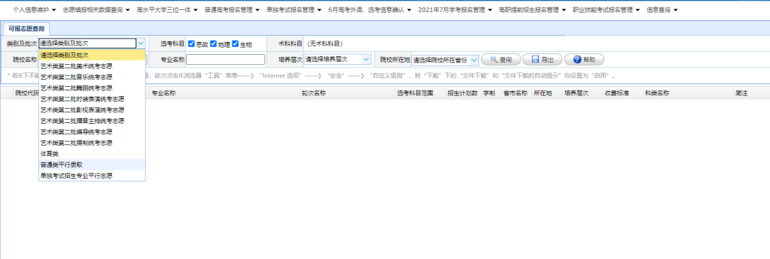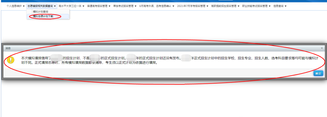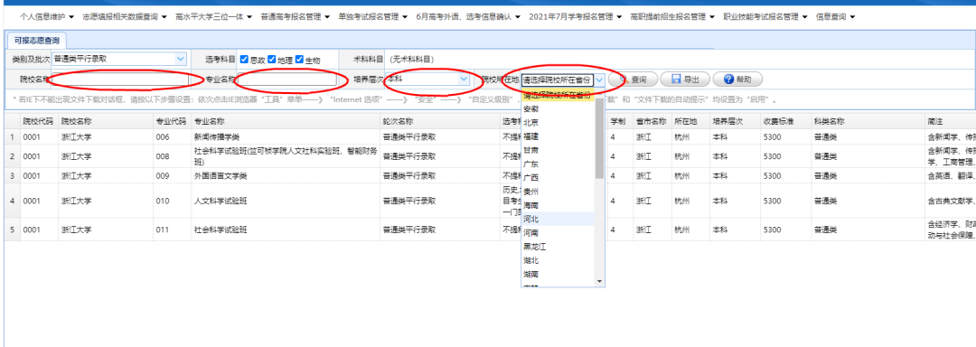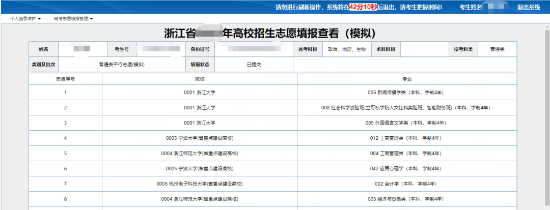 退出前面的模拟计划查询系统,选择登陆“浙江省高校招生志愿填报模拟系统”。查看填报好的志愿并且导出保存好。正式填报的最后,都是需要把最终填报志愿表格导出,做备份的,等大学公布投档分数线的时候,就可以对照填报的志愿顺序依次查看自己被录取到哪个高校。
