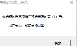 输入数字时,会出现一个提示,你选择的志愿项排在预选志愿的第1号:浙江大学——新闻传播学类,点击确定。