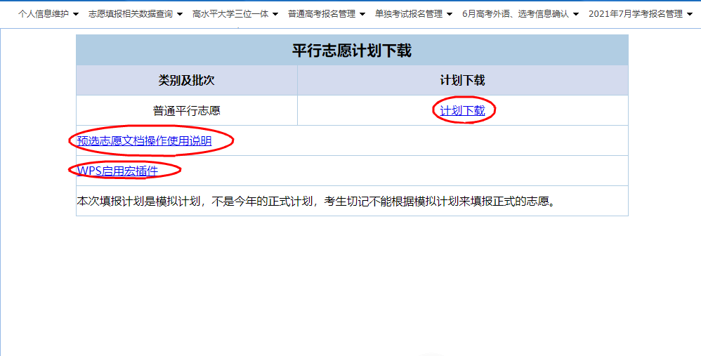 点击确定。进入到平行志愿计划下载页面,点击计划下载,下载下来的EXCEL表格认真查看,对照预选志愿文档操作指南,可以在下载来的招生计划数里面进行预选志愿的操作。