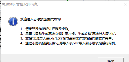 接着会出现一个欢迎进入志愿预选操作文档的提示,点击确定。