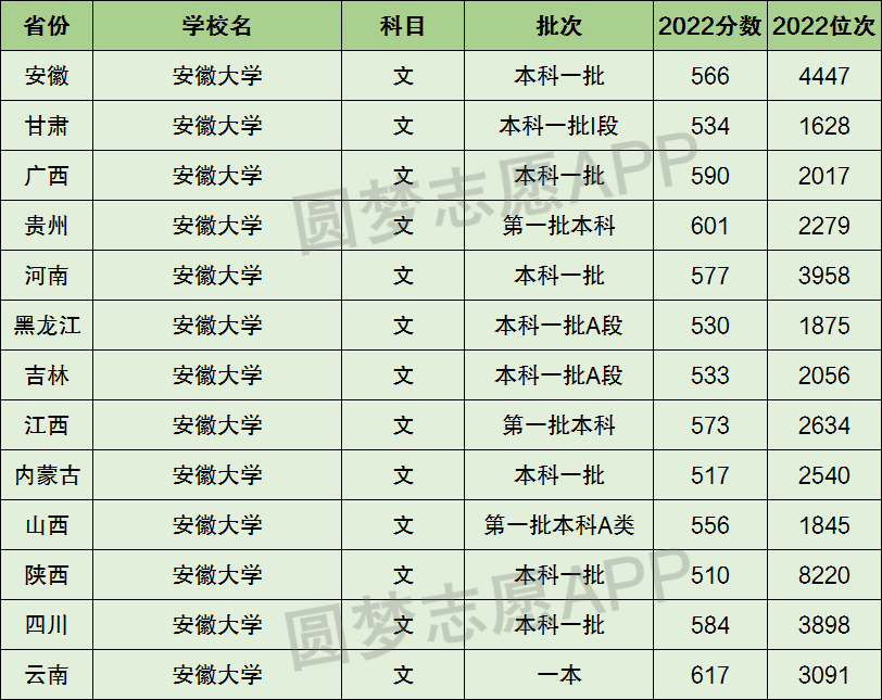 1、安徽大学在全国普通高考省份的【文科】招录数据,包含招生批次等信息: