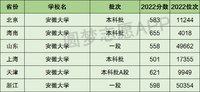 下面圆梦志愿将为大家展示安徽大学2022年在全国各省市的最低分数线和位次,大家可以在了解安徽大学在全国各省详细招生批次的同时,也顺便看看安徽大学的招生录取分数线是多少!