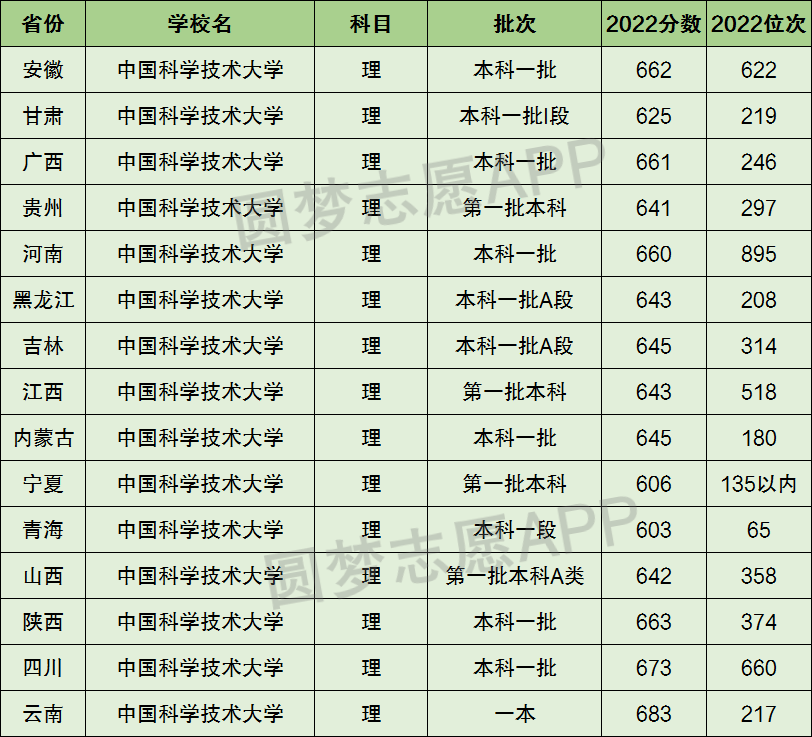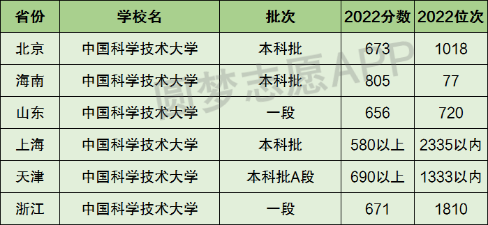 1、中国科学技术大学在全国普通高考省份的【理科】招录数据,包含招生批次等信息: