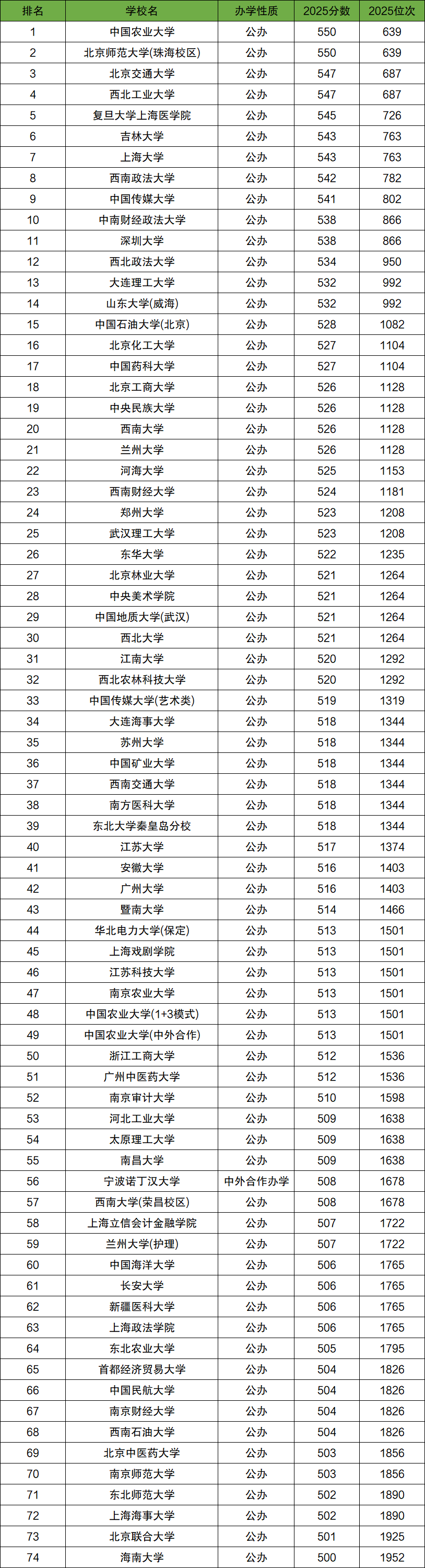 下方表格以新疆高考文科2025年的招生情况为例,展示了全国500到550分的一本大学最低录取分数线排名,共计74所,供2026年高考生参考!
