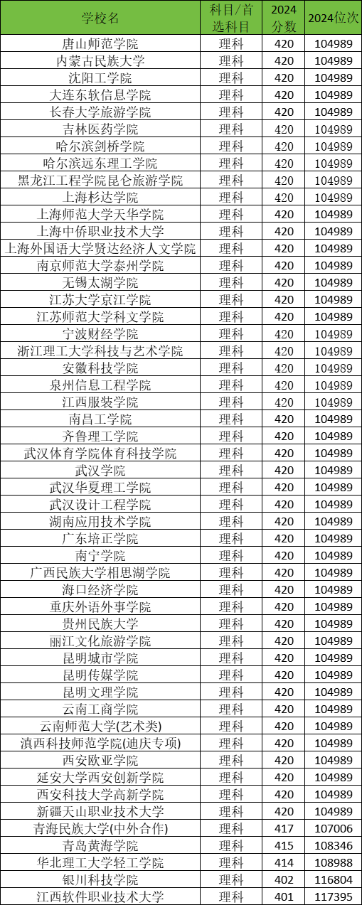 篇幅有限,我们仅为大家展示上述省份400-420分能上的二本大学的名单。