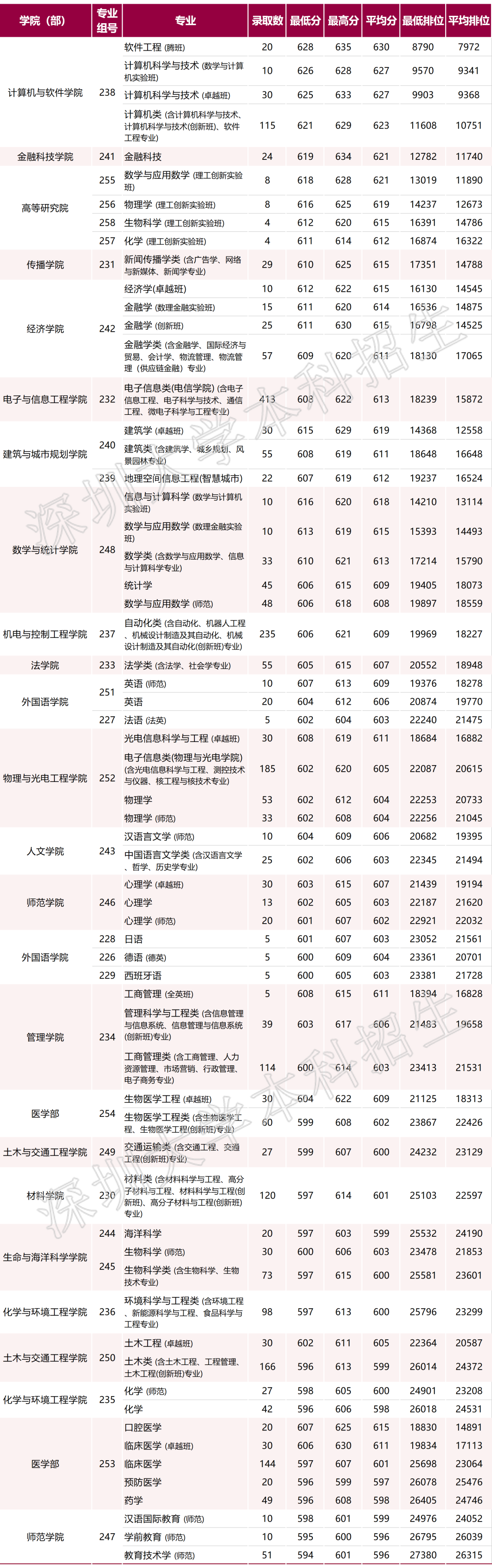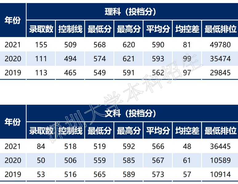 深圳大学2019年-2021年录取分数统计表普通类(广东本科)