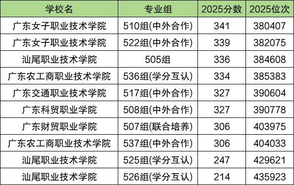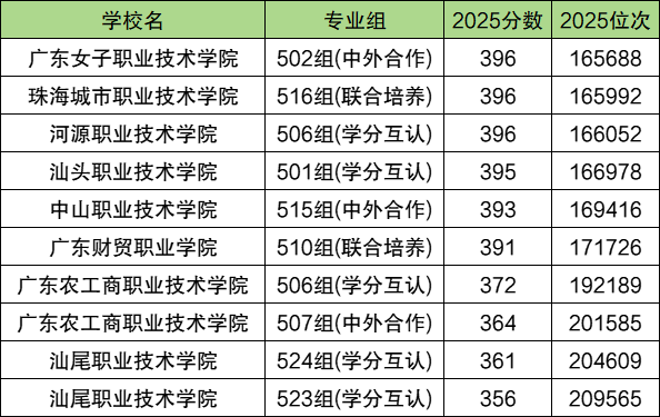 2025年广东公办大专学校最低录取分数线:历史组356分、物理类214分。收分最低的学校为汕尾职业技术学院,物理类对应526组、历史类对应523组,均为学分互认专业组招生。