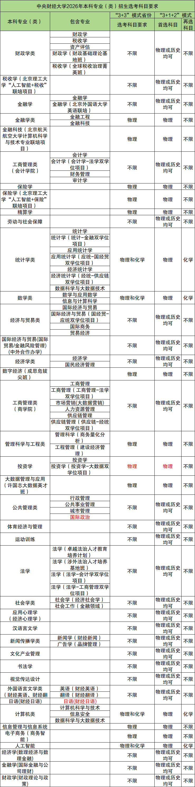 下面为2026年中央财经大学招生专业及选科要求一览表: