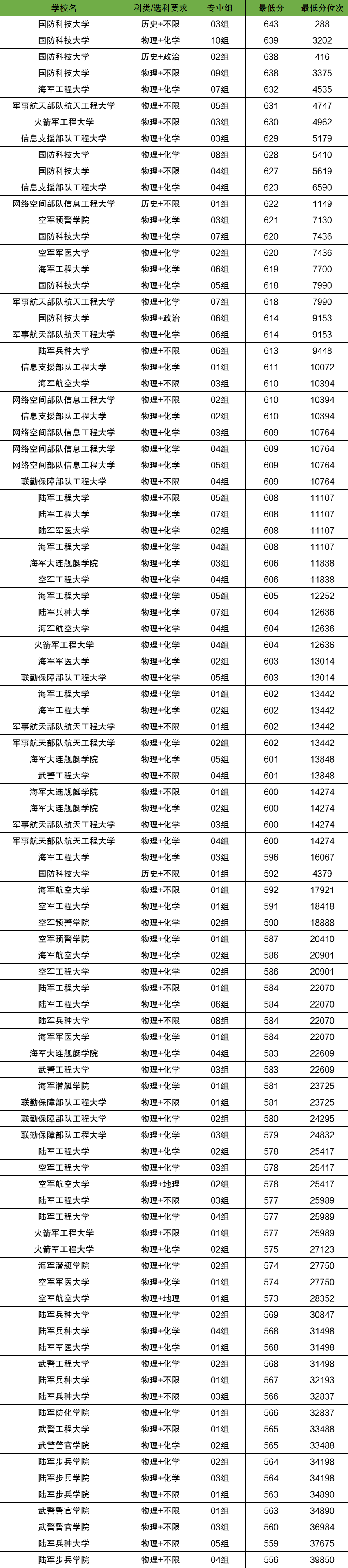 2025年湖北物理类军校录取分数线最高的是国防科技大学10专业组,2025年最低录取分数线为639分,这个专业组再选科目要求为化学。