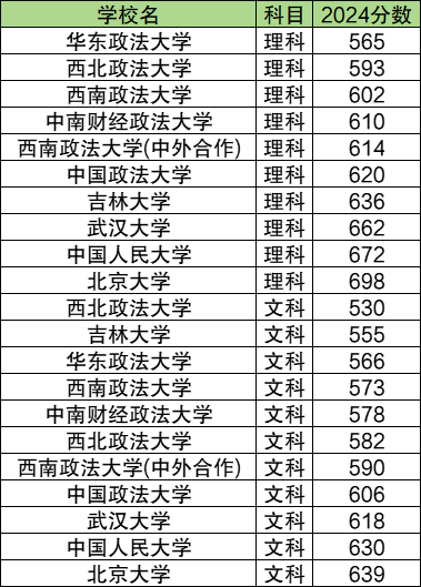 在理科方面,报考难度最大的是北京大学(689分),其次是中国政法大学(610分),这两所是唯一分数在610分以上的院校。最好考的是西北政法大学(525分),此外分数较低的还有中南财经政法大学(中外合作)(533分)。