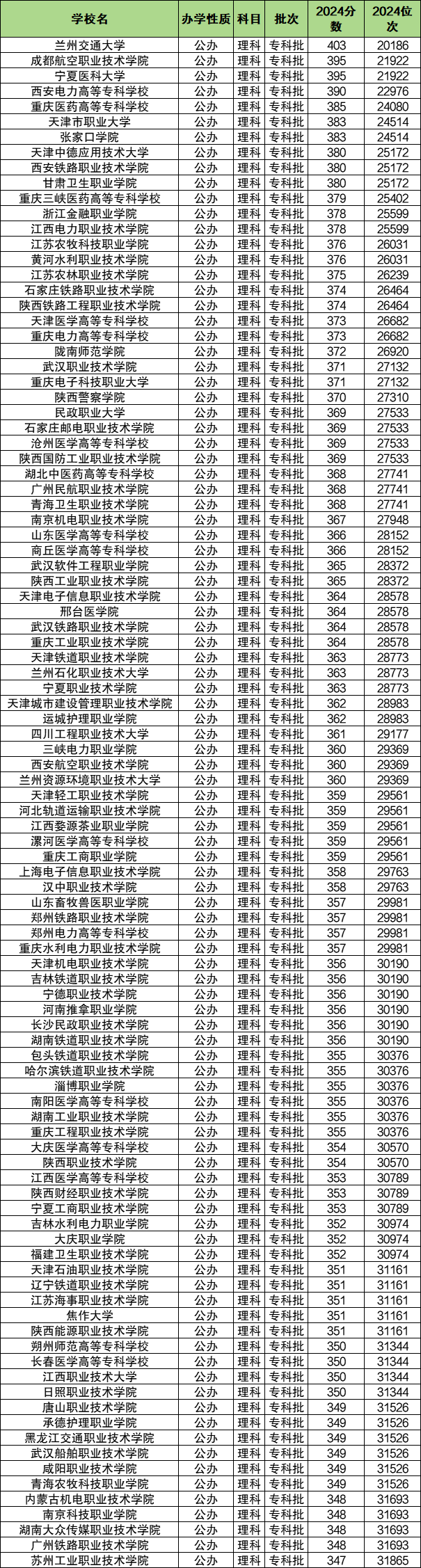 专科批大学中分数线最高的是兰州交通大学(403分),另外分数线较高的还有成都航空职业技术学院(395分)、宁夏医科大学(395分)、西安电力高等专科学校(390分)。