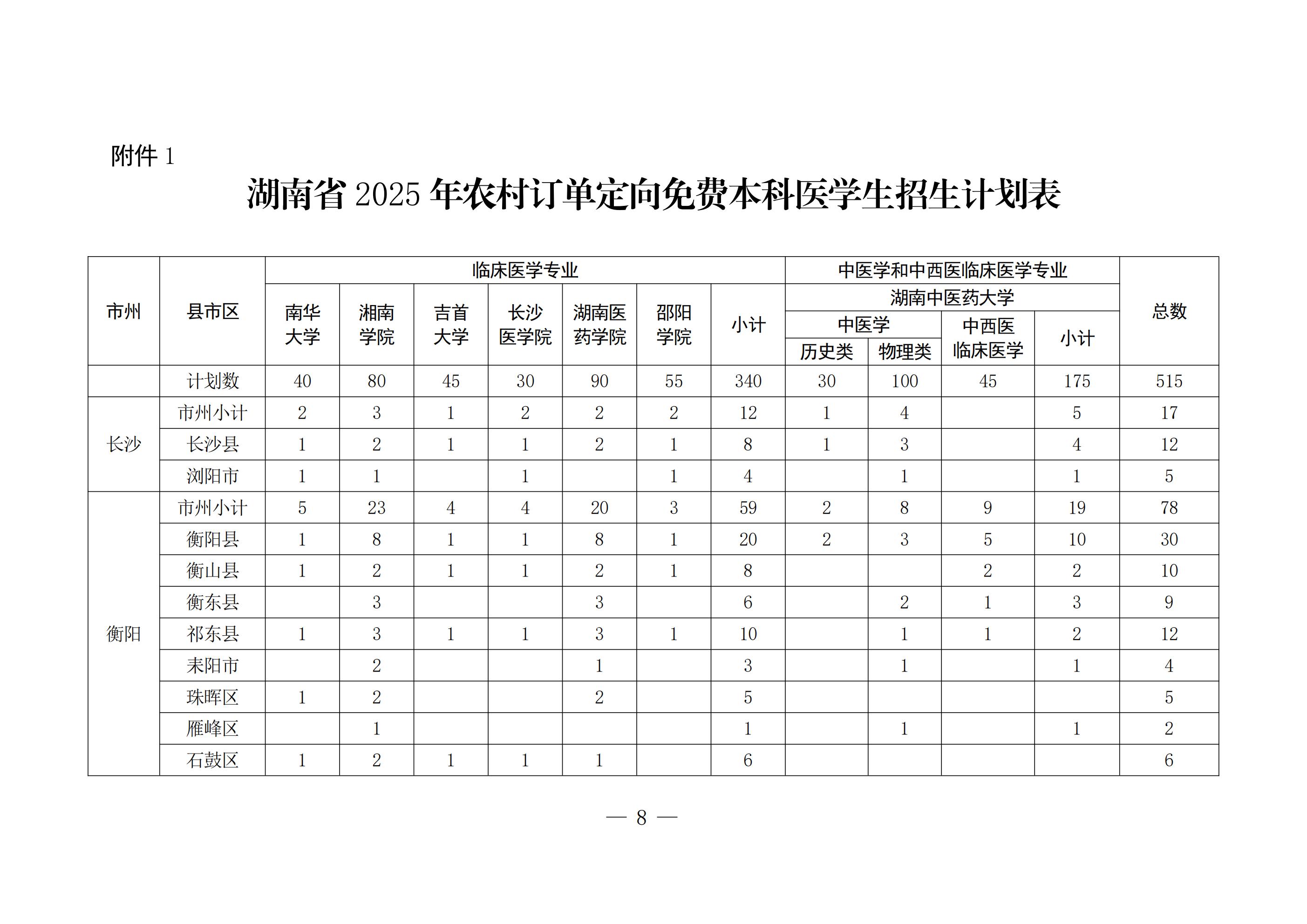 2025年,湖南省计划招收公费医学生515人,较2024年增加30人,旨在加强基层医疗卫生人才队伍建设。具体招生计划如下:
