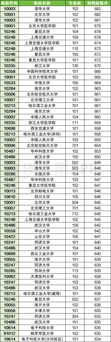 分数线排在前三十的基本是一些工科实力很强的985院校或985的医学部,包含有华中科技大学102组(653分)、北京航空航天大学701组(654分)、西安交通大学101组(658分)、哈尔滨工业大学101组(661分),如果想考上这些专业组,分数至少要达到648分,位次最好在908以内。