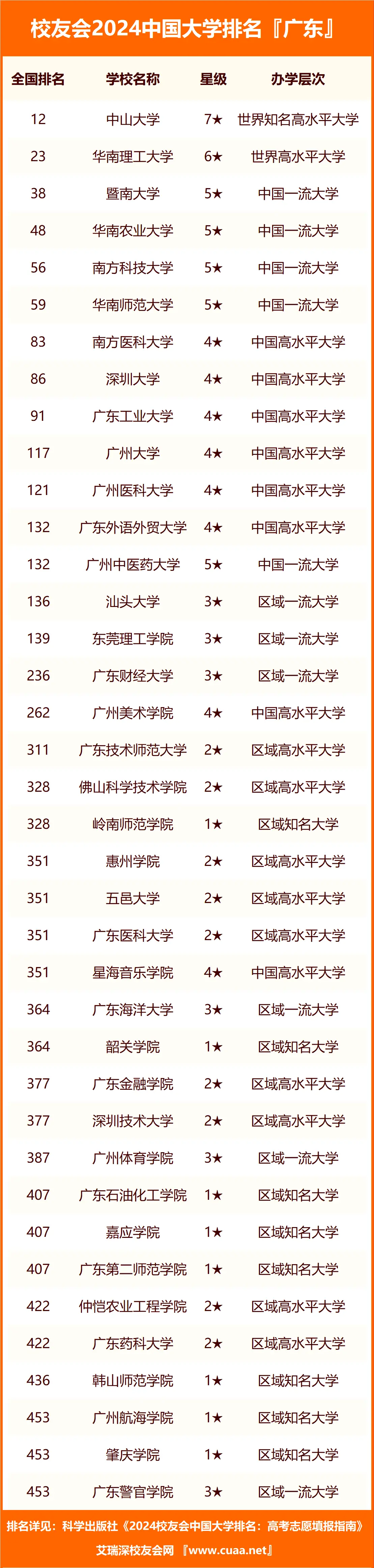 我们从校友会官方获取到了2024年全国公办院校的排名情况,同时我们为大家整理了2024年所有广东公办院校的排名数据如下: