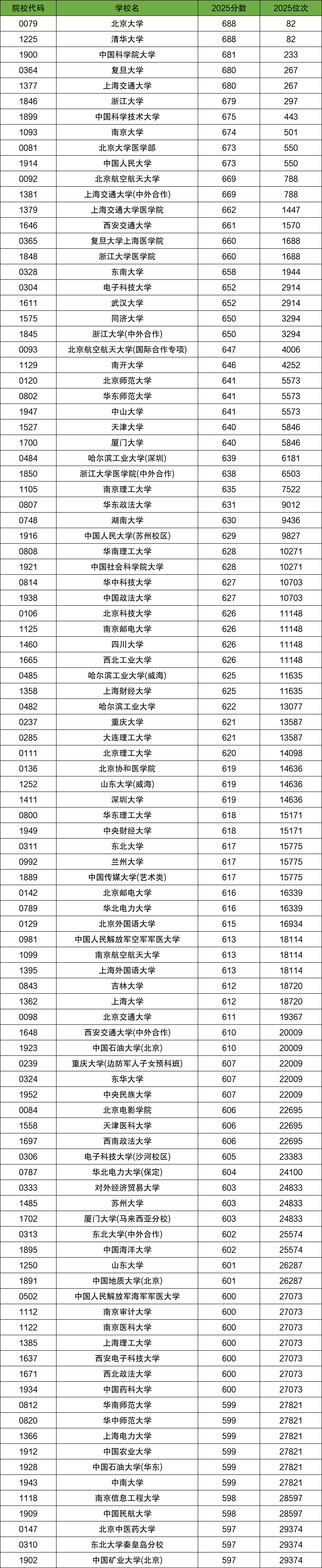 物理类分数线最高的是北京大学(代号0079),2025年最低分688,最低位次82名。其次是清华大学(代号1225),2025年最低分688,对应最低位次82名。(本文篇幅有限,仅列举分数前100)