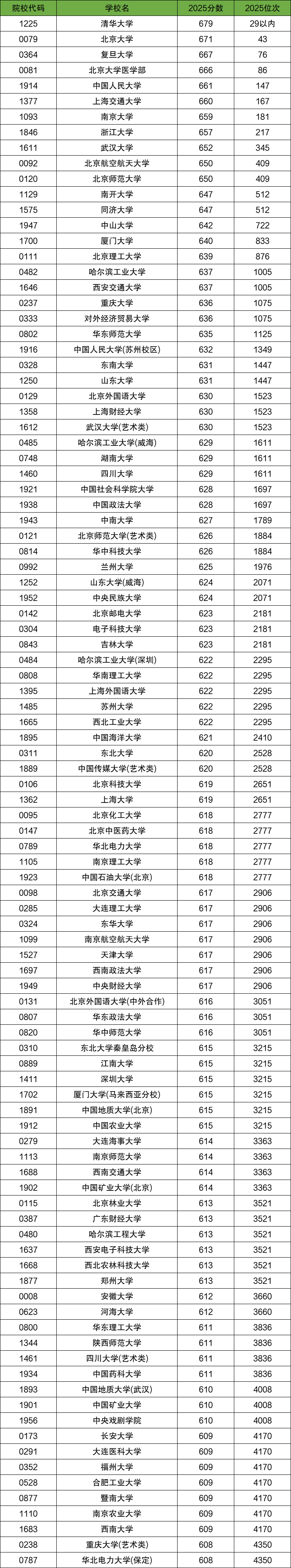 历史类分数线最高、最难考的是清华大学(代号1225),2025年最低分679,最低位次29名以内。其次是北京大学(代号0079),2025年最低分671,对应最低位次43名。(本文篇幅有限,仅列举分数前100)