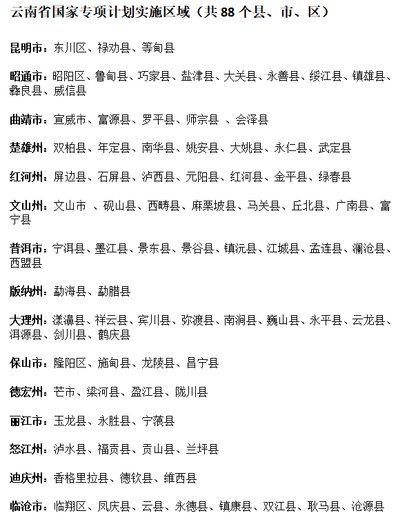 2025年云南地方专项实施区域一共有100个,包括双柏县、年定县、南华县等。具体名单如下: