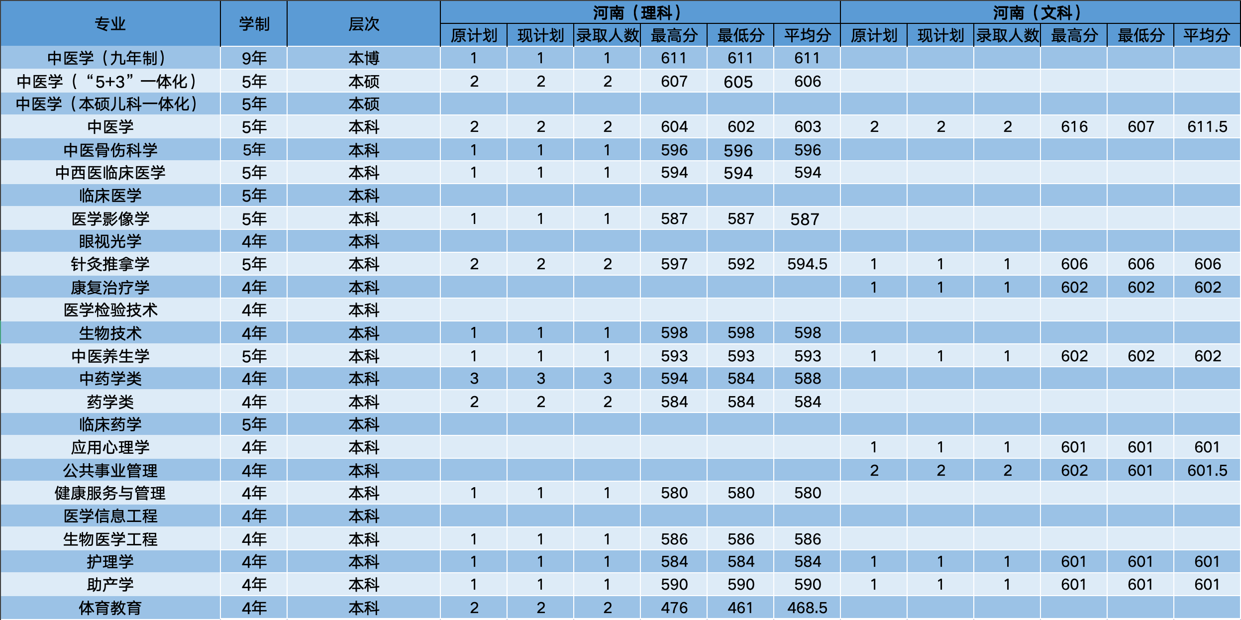 在河南理科最低451分、对应体育教育专业,最高611分、对应中医学(九年制)专业。