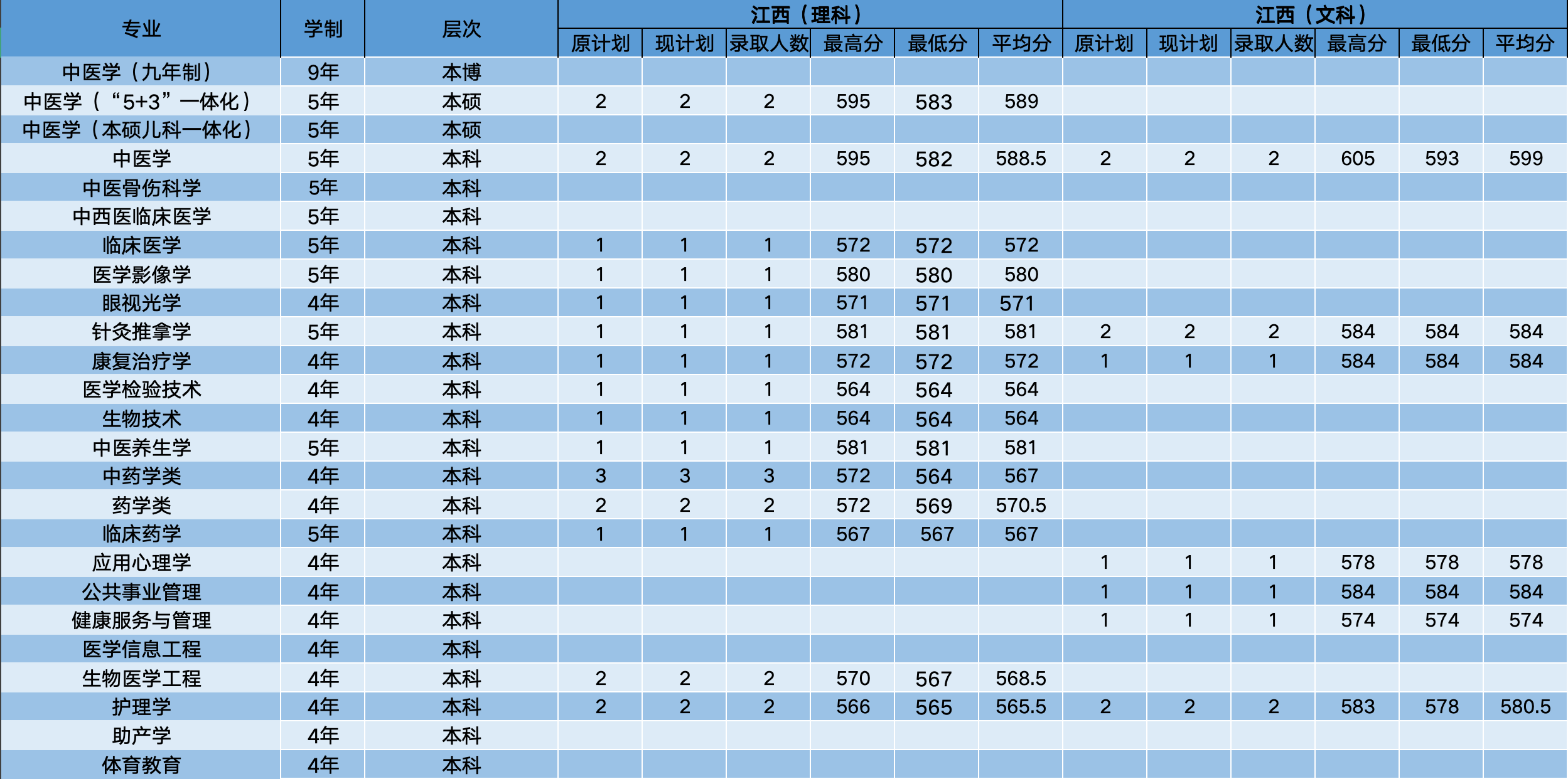 在江西理科最低564分、对应医学检验技术、生物技术、中药学类专业,最高595分、对应中医学(“5+3”一体化)、中医学专业。
