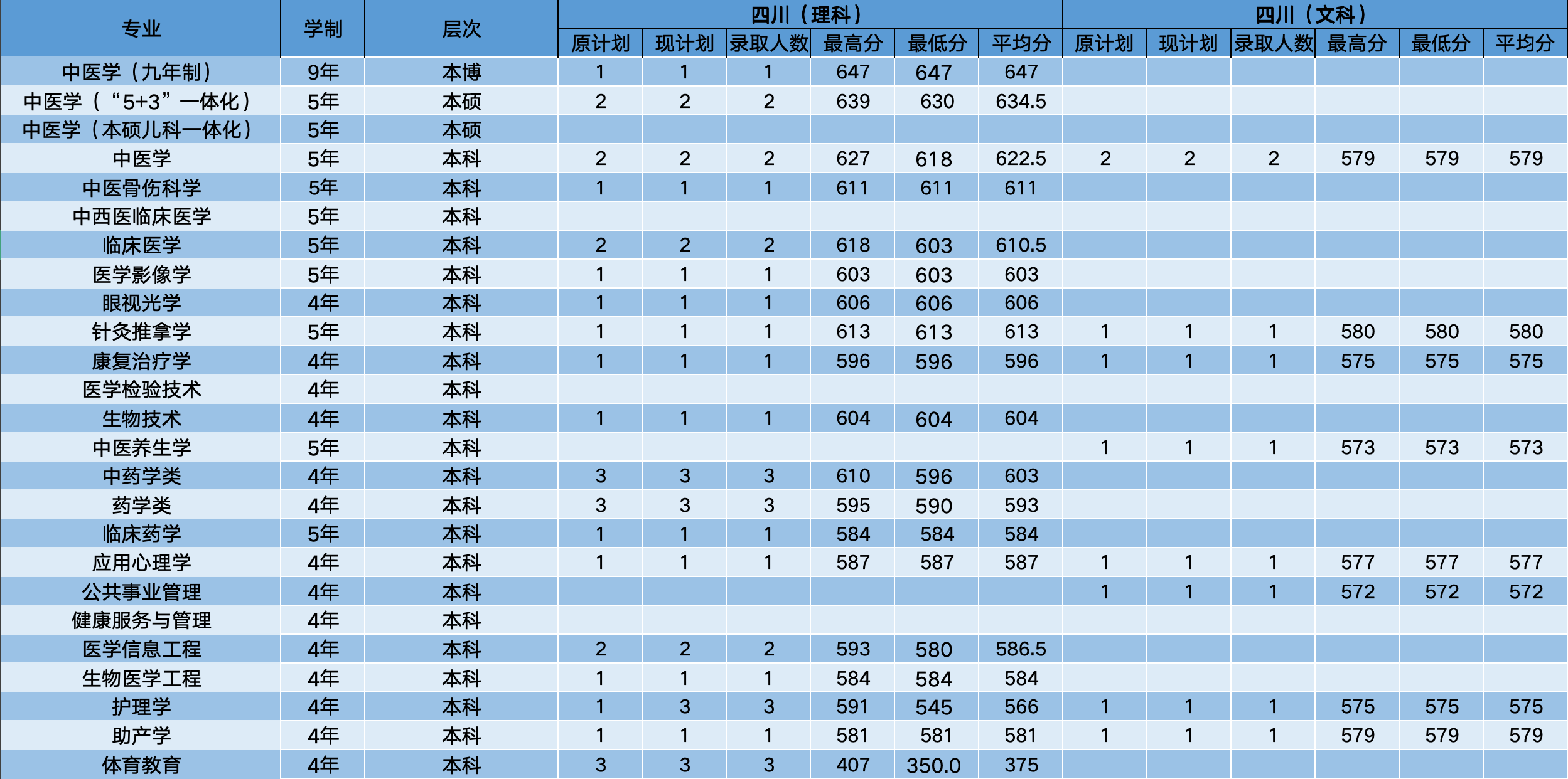 在四川理科最低350分、对应体育教育专业,最高647分、对应中医学(九年制)专业。