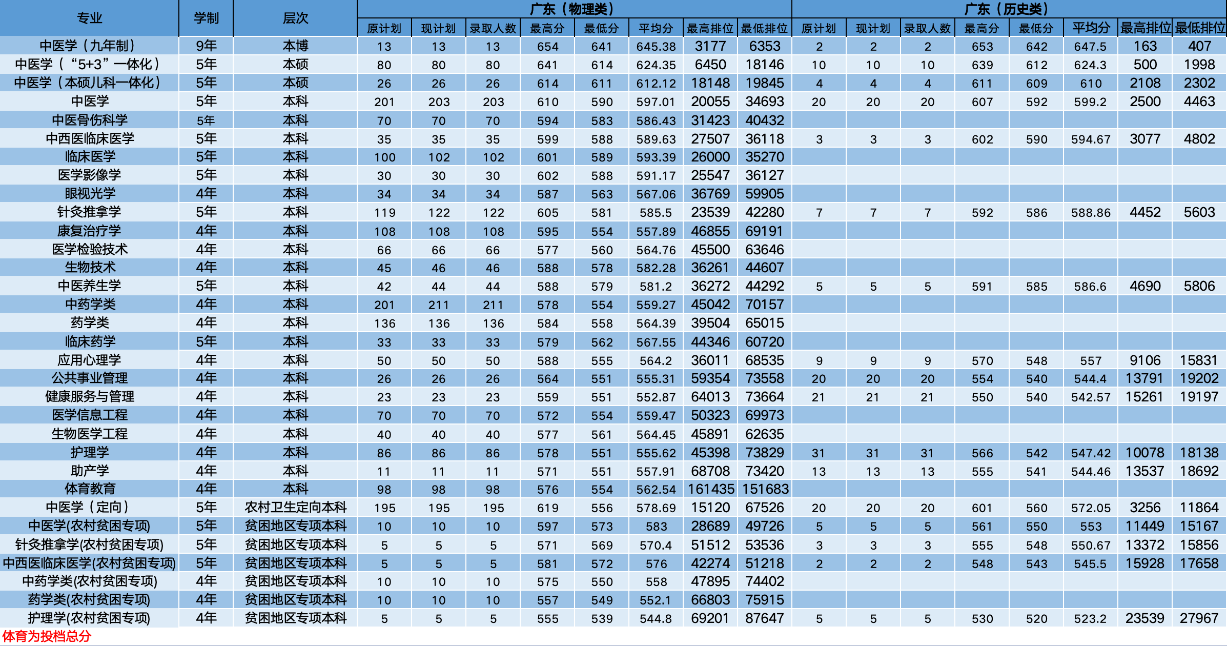 在历史类最低520分、护理学(农村贫困专项)专业,最高653分、对应中医学(九年制)专业。