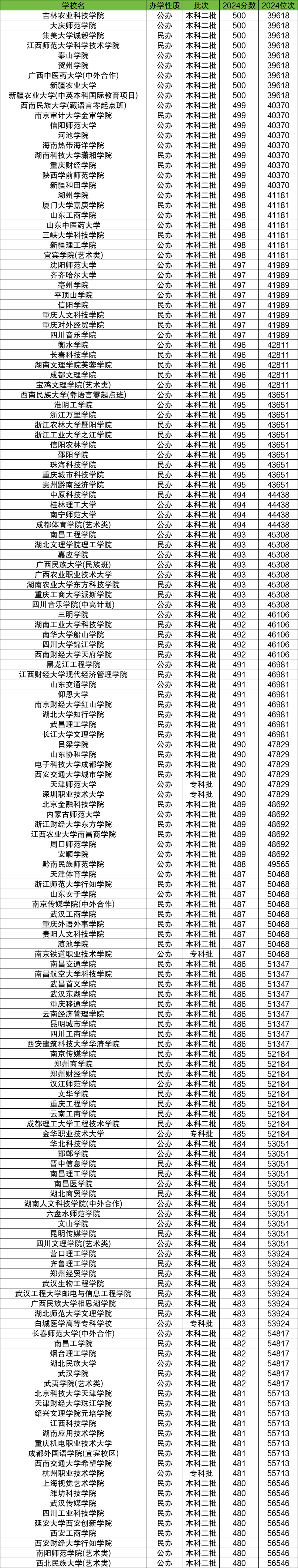 2024年文科录取分数线在480到500分能上的大学一共有156所,其中以二本大学居多。