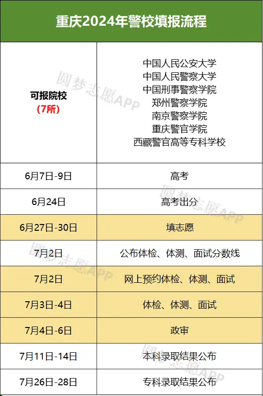 2025年重庆警校报考流程主要包括填报志愿(6月27日-30日)、政审(7月4日-6日)、体检面试(7月3日-4日)等。想要报考警校需要满足户籍、年龄16到22岁、未婚、符合公安院校体检标准等条件。完整流程及时间安排表如下。