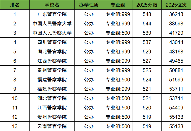 下方表格以福建高考物理类2025年的招生情况为例,展示了全国500到550分的警校最低录取分数线排名,共计8所(13个院校专业组),供2026年高考生参考!