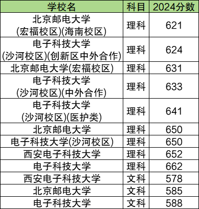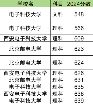在文科方面,所有两电一邮学校的分数都在548分及以上,其中文科最低录分是548分,对应的学校是电子科技大学。