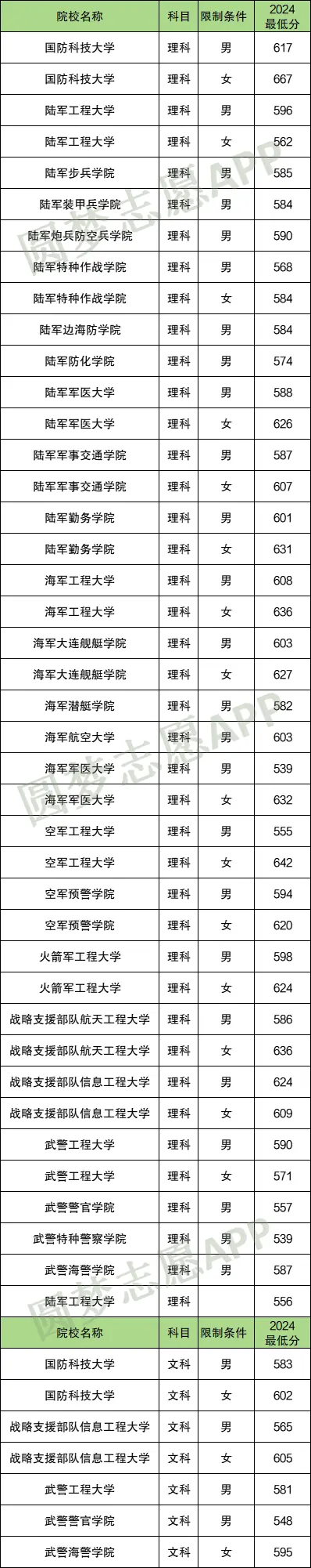 2024年录取分数最高的院校是国防科技大学:女生最低分667分;录取分数较低的院校是武警特种警察学院:男生最低分539分。