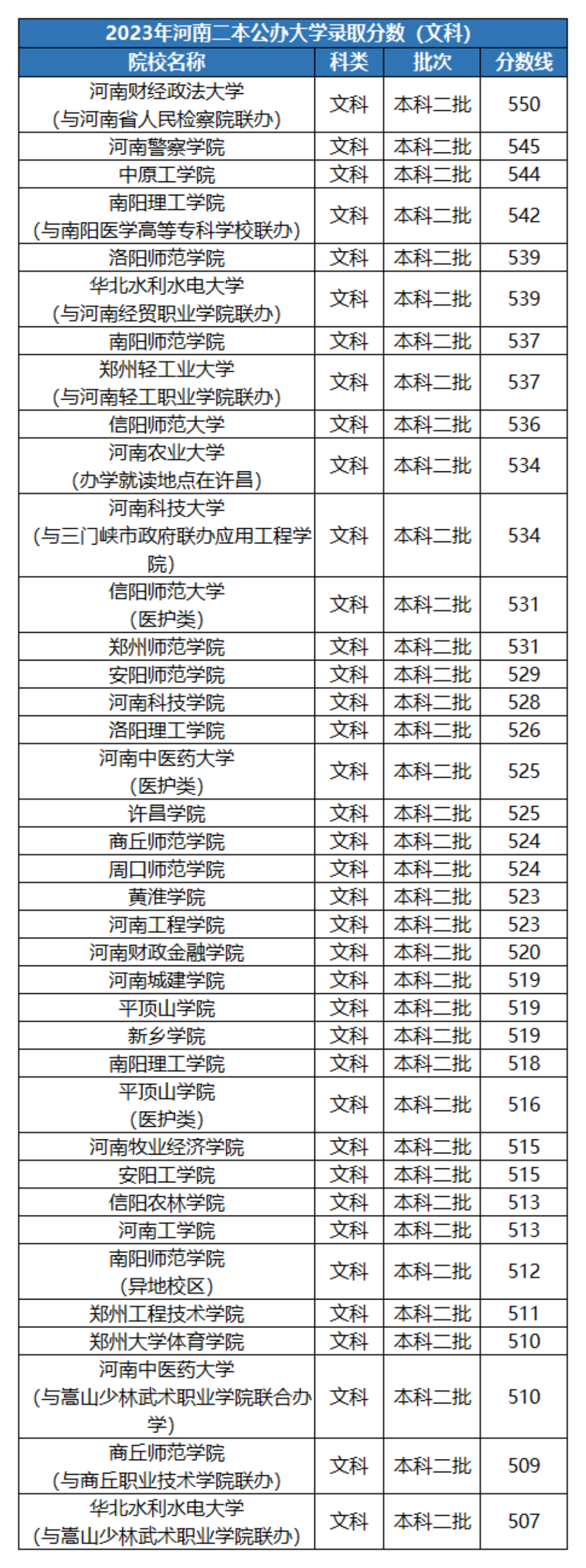 2023年文科考生至少需要507分及以上才能在二本批次报考省内公办大学,根据河南文科二本批次院校投档情况来看,分数线最低的院校是华北水利水电大学,该校与嵩山少林武术职业学院联办的汉语国际教育、英语专业(2个专业培养模式采用2+2模式,即前2年在联办高职院校就读,后2年回到华北水利水电大学就读)投档分数线为507分。