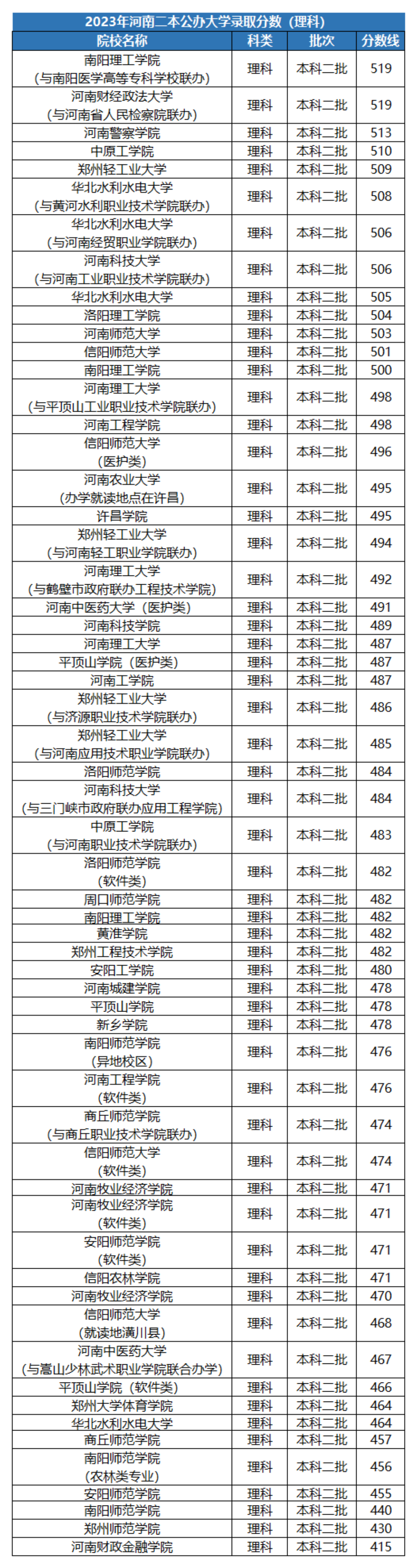 2023年理科分数线最高的二本公办大学有2所,第1所是南阳理工学院,该校在二本批次招生的中医学(与南阳医学高等专科学校联办)专业投档分数为519分;第2所是河南财经政法大学,该校的法学专业(与河南省人民检察院联办)投档分数同样为519分。