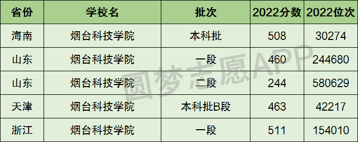 下面圆梦志愿将为大家展示烟台科技学院2022年在全国各省市的最低分数线和位次,大家可以在了解烟台科技学院在全国各省详细招生批次的同时,也顺便看看烟台科技学院的招生录取分数线是多少!