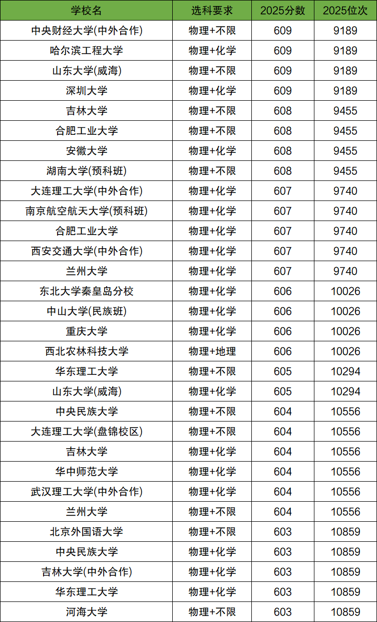 位次在10000左右的基本属于985或实力较强的211院校,分数在603-609分之间。其中位次相对靠后的有北京外国语大学、中央民族大学、吉林大学(中外合作)、华东理工大学、河海大学。