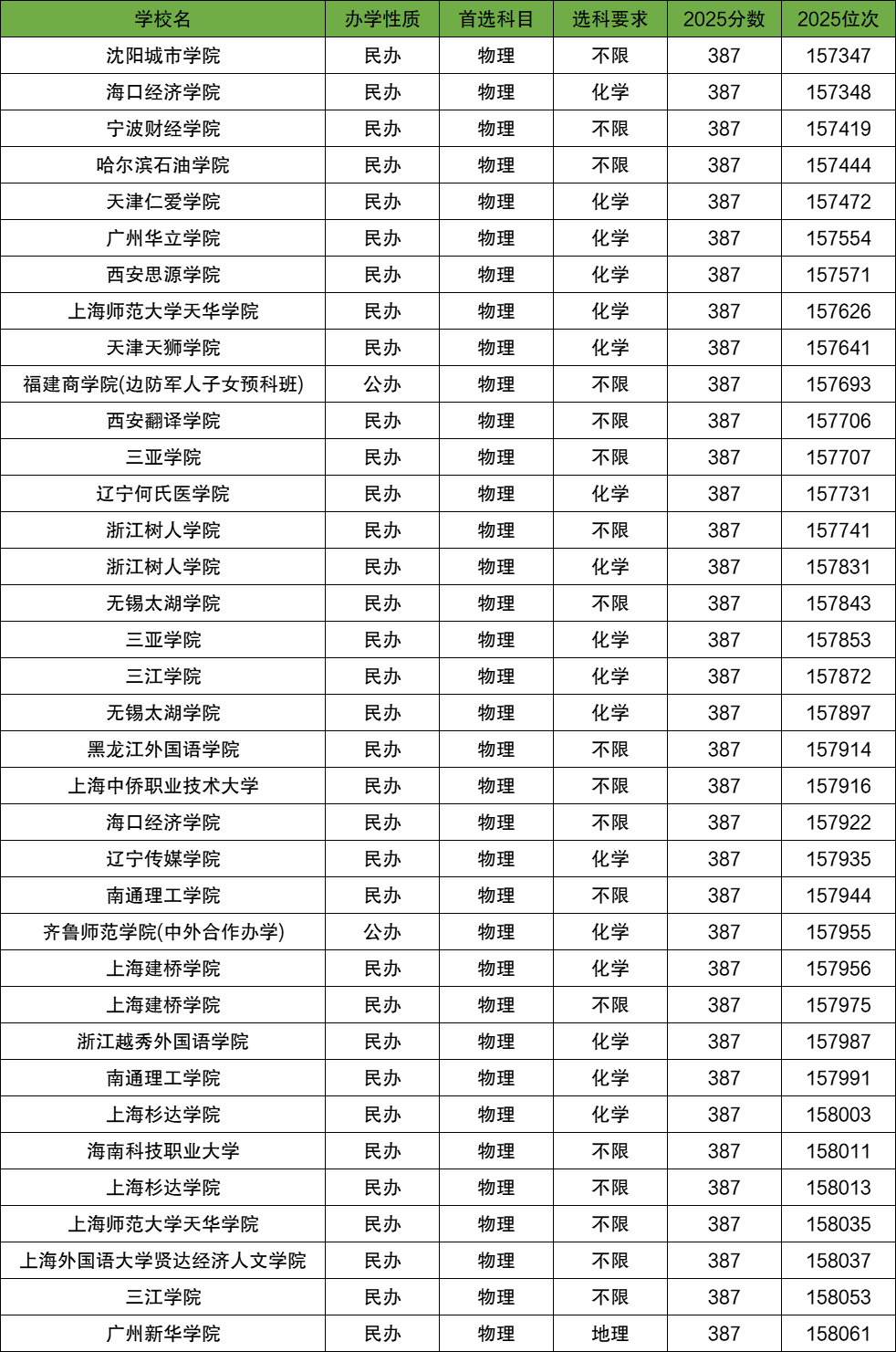 以贵州物理类为例,2025年在贵州物理类本科线收分最低的公办大学一共有2所,分别是福建商学院(边防军人子女预科班)、齐鲁师范学院(中外合作办学),这2所本科线最低的公办大学录取分数线为387分,刚好与贵州物理类本科批分数线持平,也是贵州物理类可以低分捡漏的公办本科院校。