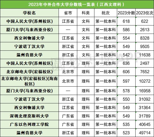 对于江西考生来说,如果想上中外合作院校的话,理科至少要比本科线高78分,文科至少要比本科线高70分。关于更多中外合作院校的录取分数线,小编都在本文进行了整理,供查阅。