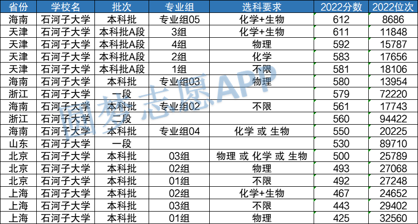 可以看到,石河子大学2022年在以下省份的录取分数线中,最高的是海南612分,最低的是上海425分。