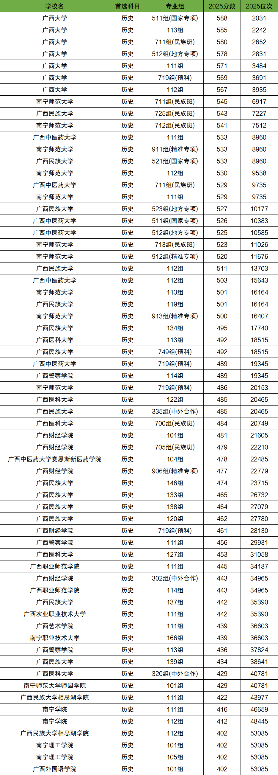 如下仅为各位整理了2025年南宁各大学历史科目考生的最低分数线一览表,供大家参考: