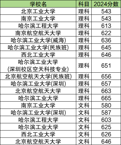 在文科方面,所有国防七子学校的分数都在580分及以上,其中报考难度最大的是北京航空航天大学(646分),最好考的是南京工业大学(580分)。