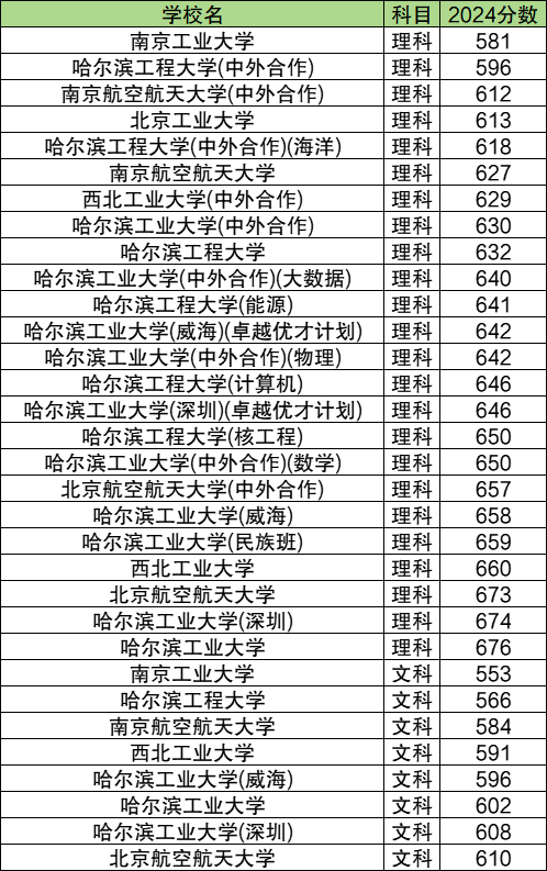 在理科方面,报考难度最大的是哈尔滨工业大学,录取线是676分。理科上国防七子学校的最低分是581分,对应的院校是南京工业大学。