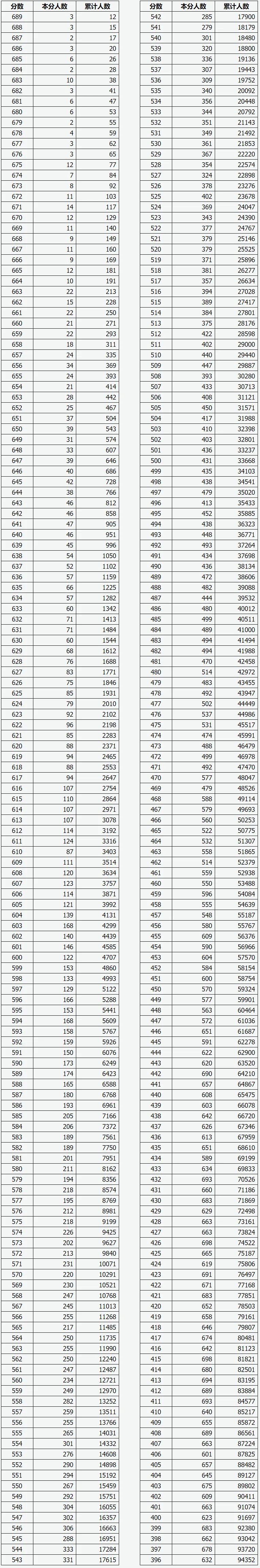 达到396分的考生有94352人,达到450分的有59324人,达到500分的有33668人,达到530分的有21853人,达到550分的有15459人,达到600分的有4707人,达到650分的有543人,达到670分的有129人,689分及以上的有12人。