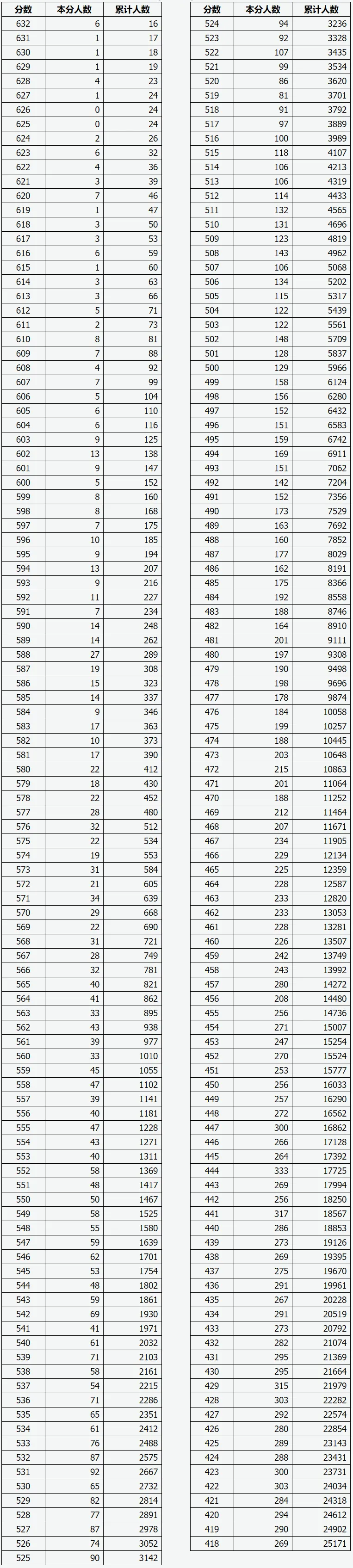 达到418分的考生有25171人,达到450分的考生有16033人,达到500分的有5966人,达到525分的有3142人,达到550分的有1467人,达到600分的有152人,632分及以上有16人。
