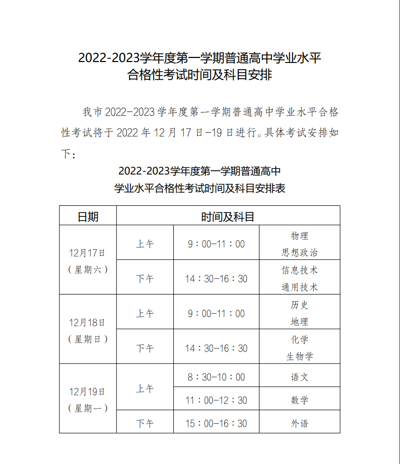 重庆市2022-2023学年度第一学期普通高中学业水平合格性考试将于2022年12月17日-19日进行,具体考试时间安排如下。