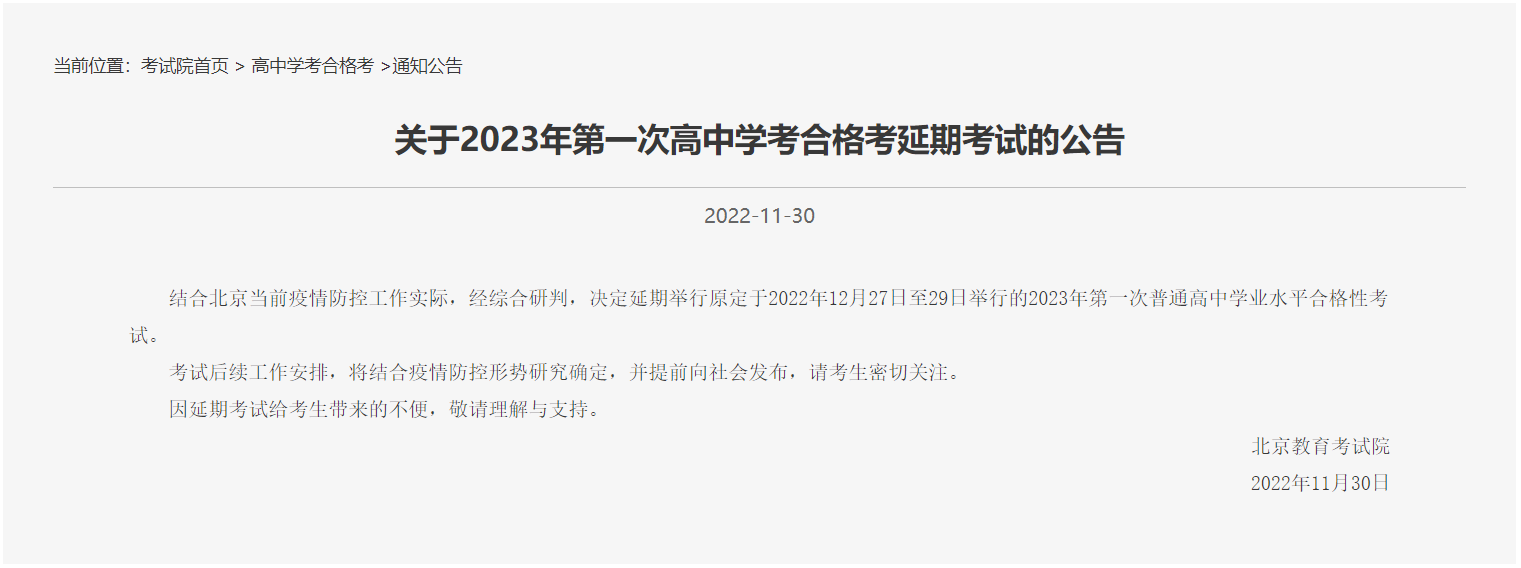 (结合北京当前情况,经综合研判,决定延期举行原定于2022年12月27日至29日举行的2023年第一次普通高中学业水平合格性考试。)