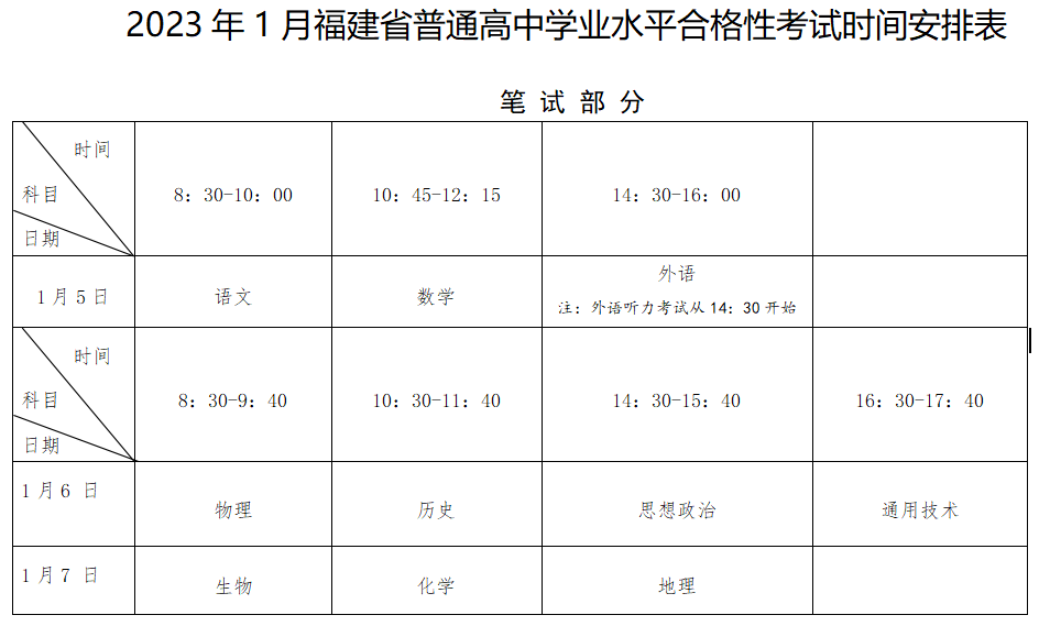 2023年福建1月学考考试时间为2023年1月5日-1月8日,以下为2023年1月福建省普通高中学业水平合格性考试时间安排: