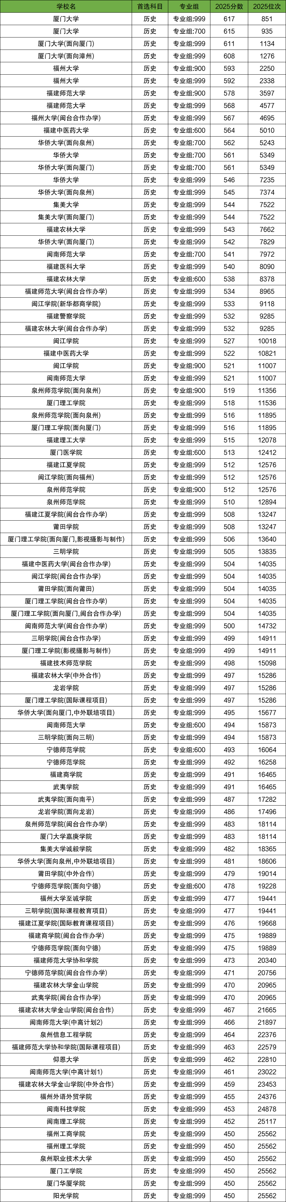 2025年招录数据显示,历史类分数最低的大学有6所,为福州工商学院(999组)、福州理工学院(999组)、泉州职业技术大学(999组)、厦门工学院(999组)、厦门华厦学院(999组)、阳光学院(999组),分数为450分,属于压线招生,最低录取位次为25562名。