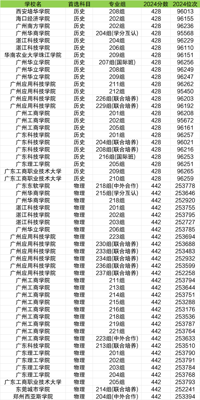 广东省2024年民办本科院校最低分:历史类428分、物理类442分。