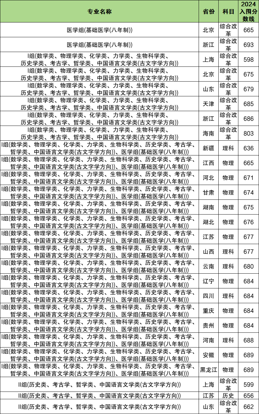 北京大学强基计划入围分数线为:安徽最低689分、北京最低665分、甘肃最低674分等;各专业分数线为:医学组(基础医学(八年制))665分-693分、I组598分-803分等。