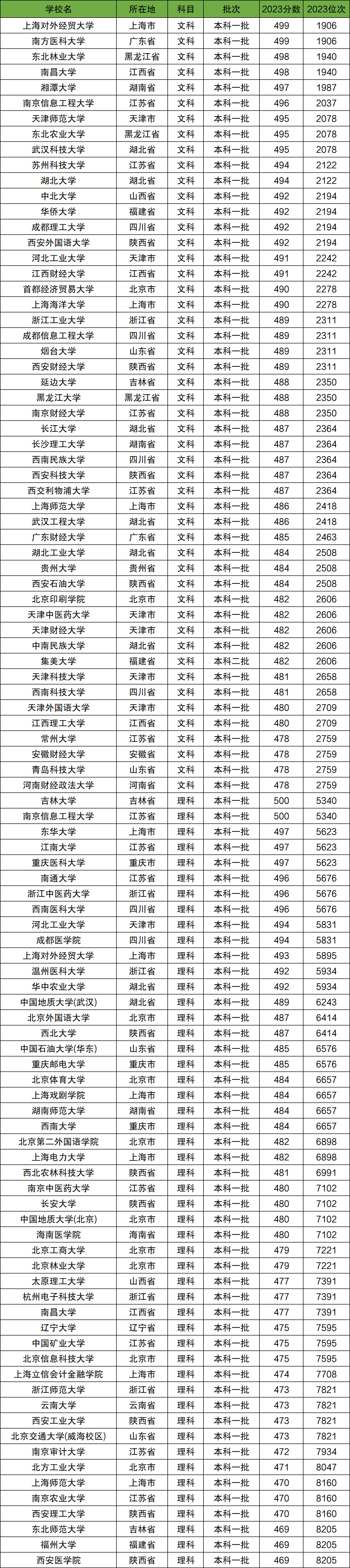 下表为2023年全国大学在新疆高考中,录取分数在450分的大学名单。