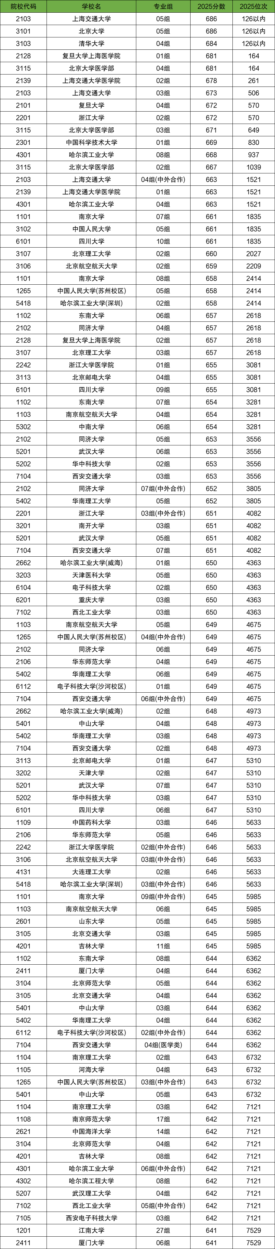 物理类分数线最高的是上海交通大学(代号2103),2025年最低分686,最低位次126名以内。其次是北京大学(代号3101),2025年最低分686,对应最低位次126名以内。(本文篇幅有限,仅列举分数前100)